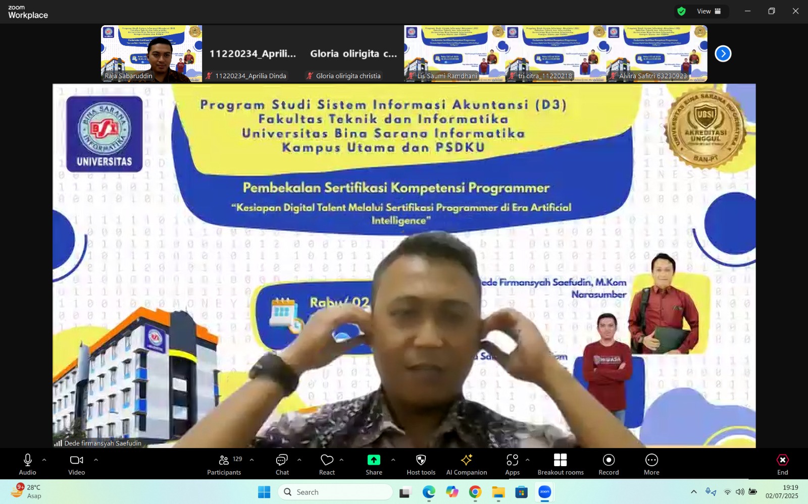 Karawang, 2 Juli 2025 – Dalam rangka mempersiapkan mahasiswa menghadapi tantangan di era digital yang semakin kompetitif, Program Studi Sistem Informasi Akuntansi Kampus Kabupaten Karawang, Universitas Bina Sarana Informatika (UBSI), sukses menggelar Seminar Sertifikasi Programmer bertajuk “Kesiapan Digital Talent Melalui Sertifikasi Programmer di Era Artificial Intelligence”. Kegiatan ini dilaksanakan secara daring melalui Zoom Meeting pada Rabu, 2 Juli 2025, pukul 18.30 hingga 21.00 WIB dan diikuti oleh mahasiswa semester 4 dari program studi tersebut.